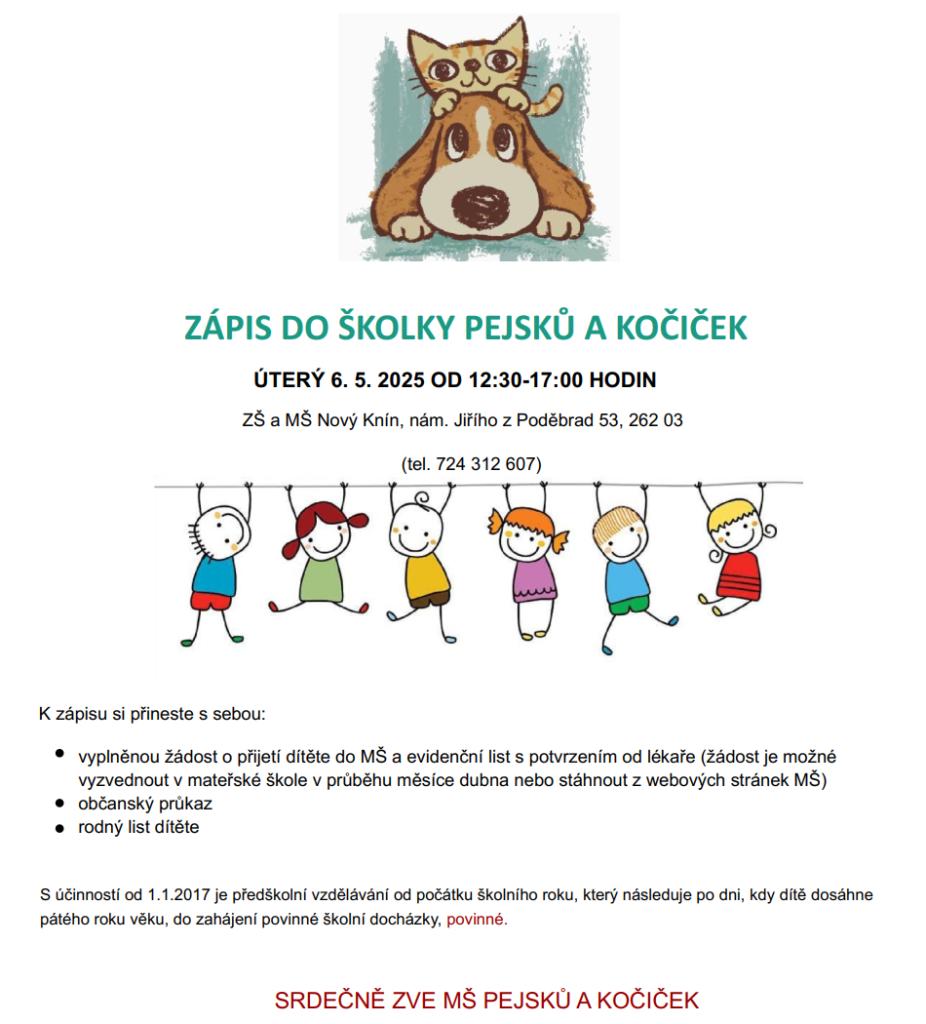 S účinností od 1.1.2017 je předškolní vzdělávání od počátku školního roku, který následuje po dni, kdy dítě dosáhne pátého roku věku, do zahájení povinné školní docházky, povinné.