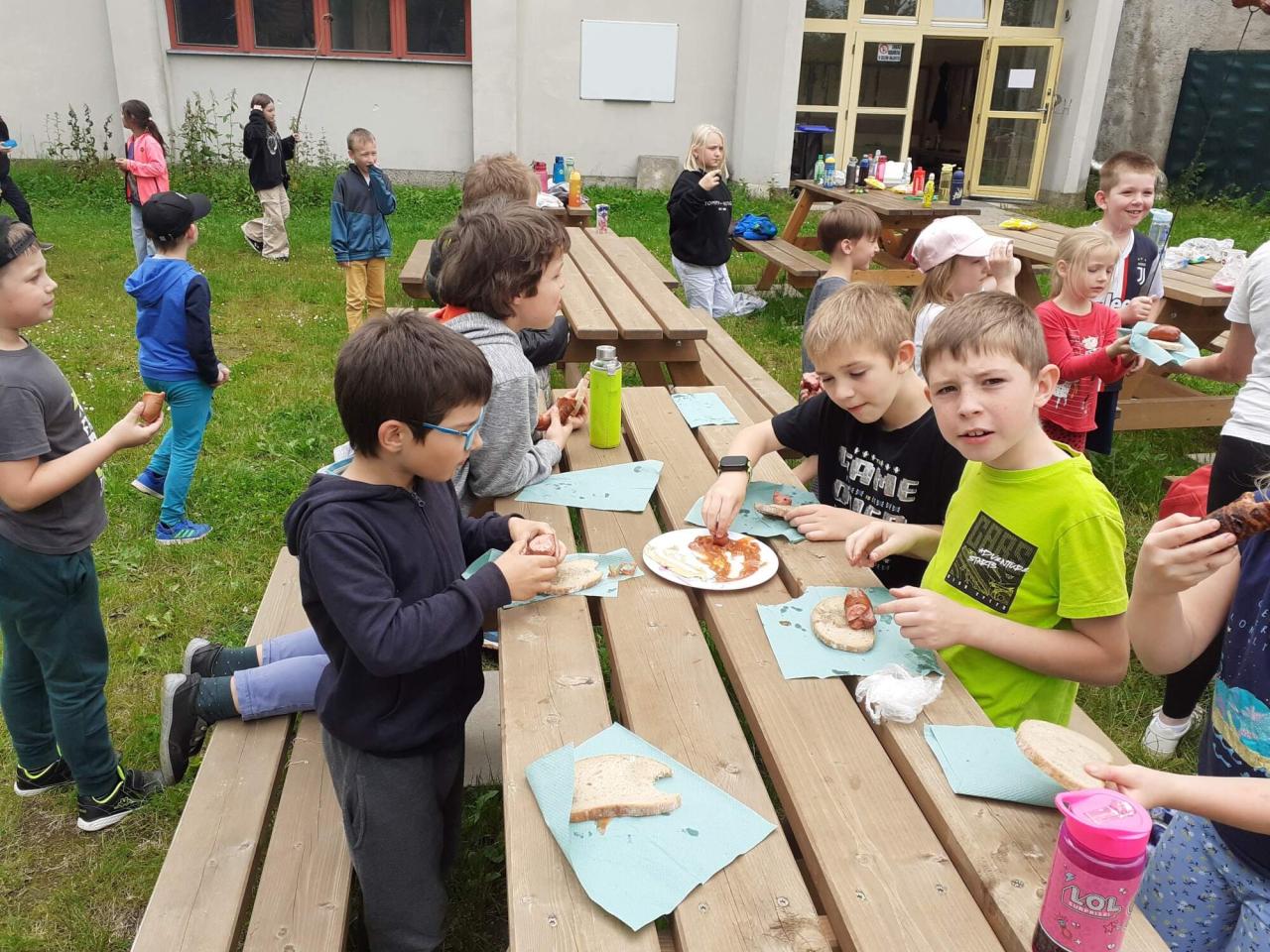 Dne 4.6. jsme s družinou prožili opět super odpoledne na školní zahradě, kde jsme s dětmi opékáli buřty, jablka, maršmelouny atd.. tímto bych chtěla za všechny moc poděkovat panu Šťastkovi,který nám daroval výborné špekáčky! Všichni jsme měly plná bříška a byli jsme spokojeni. Kdo nechtěl opékat nebo měl snědeno, mohl si vyzkoušet chůzi na lyžích, v holinách nebo v ploutvích. Děti vymýšlely i velmi inovativní varianty chůze po čtyřech s holinkami na rukou. Těšíme se na další družinová odpoledne plných akcí a her.