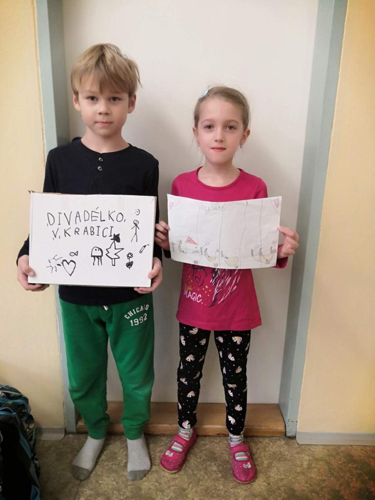Absolutním vítězem se stal Toník H. z 1.B, který vytvořil nádherné divadélko v krabici s pozadím a postavičkami (viz. foto níže). Na druhém místě se mezi mladšími umístila Ella L. z 1.B s vlastním komiksovým příběhem o kočičce, spolu s Anežkou Z. z 2.A, která napsala a nakreslila knihu o kouzelném králíčkovi. Třetí místo v mladší kategorii obsadil František S. z 1.A s kreslenou postavičkou telátka Poplety.