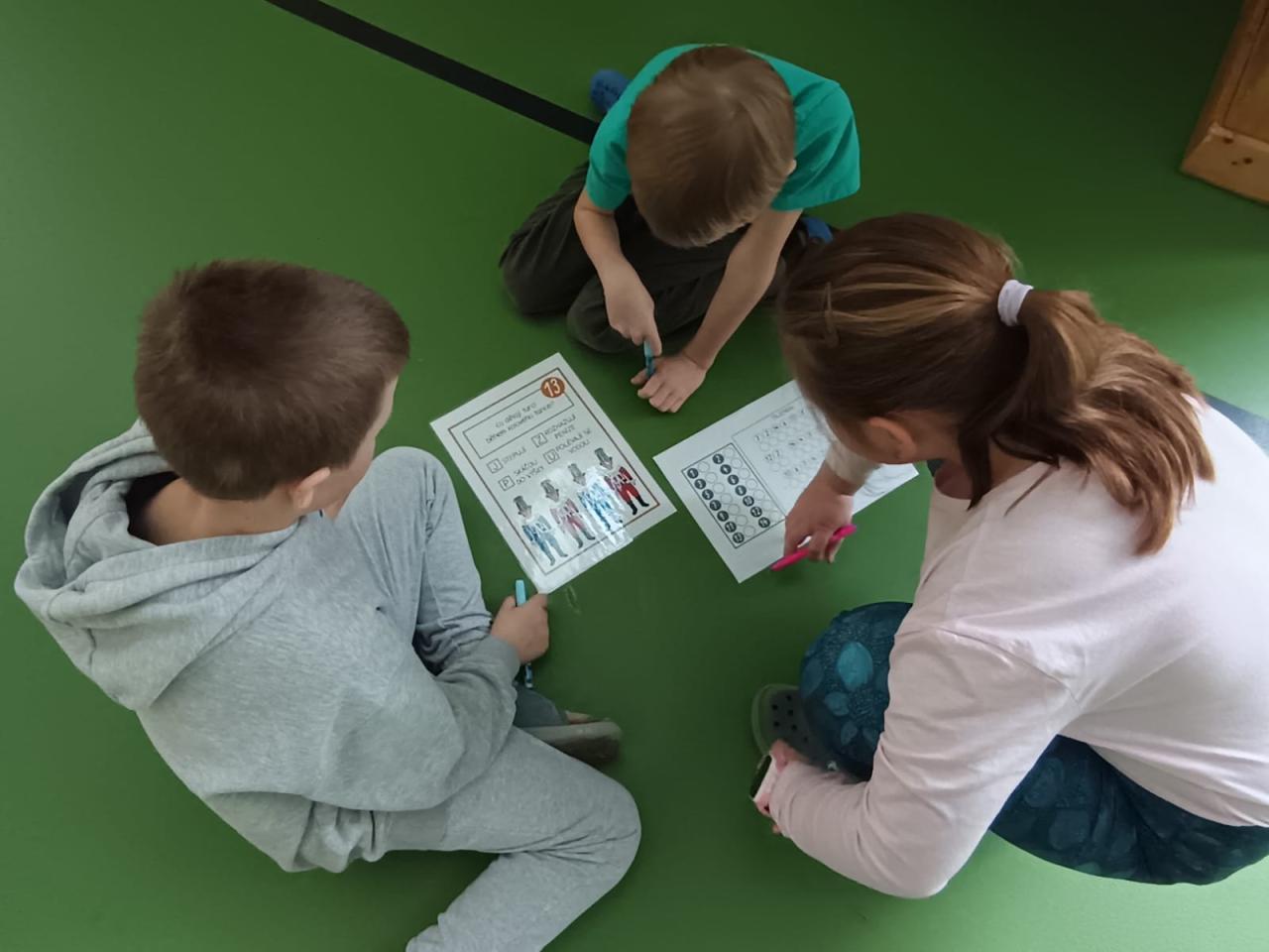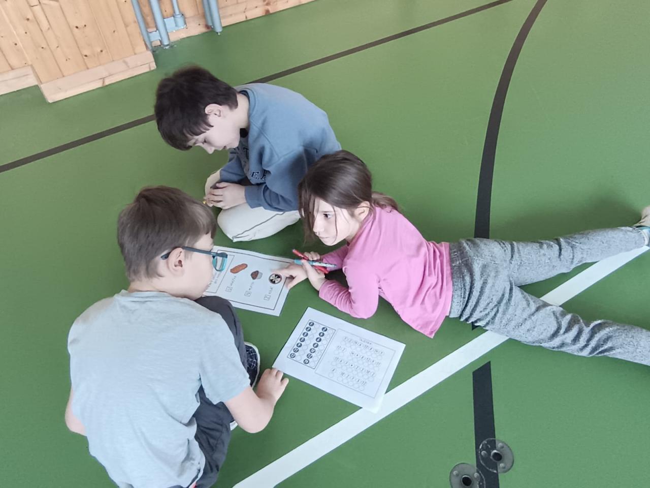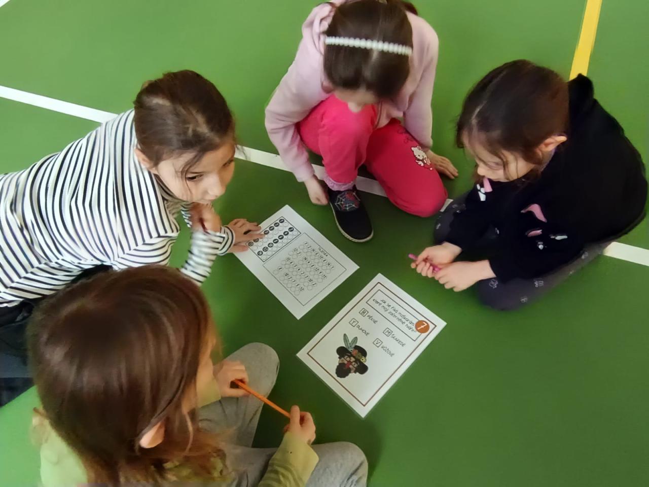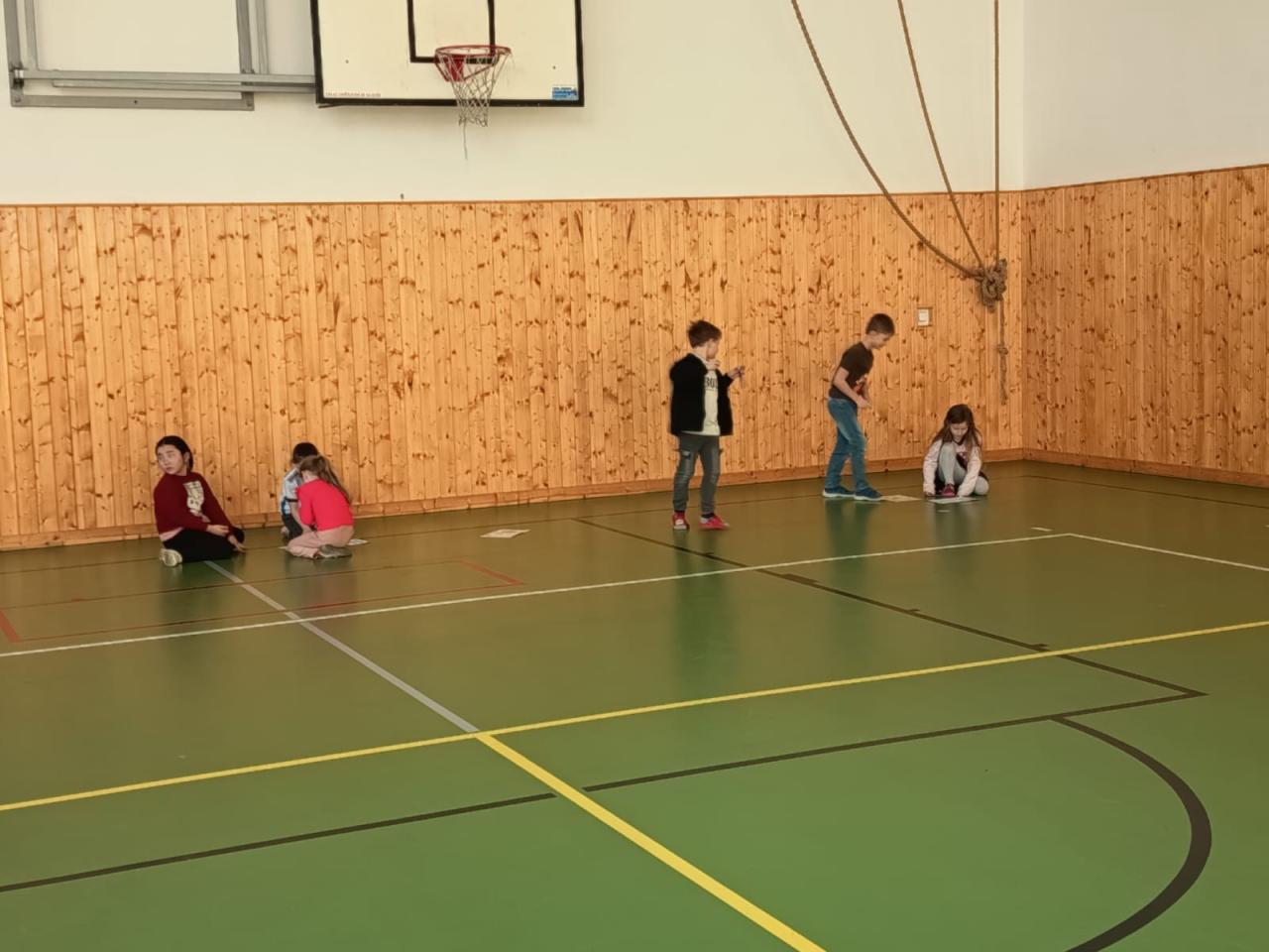 Další část programu se odehrávala ve velké tělocvičně. Děti zde čekalo 14 očíslovaných otázek, které byly rozmístěny po prostoru. Úkolem skupin bylo najít správné odpovědi, propojit je s číslem a písmenem a společně dojít ke správnému řešení. Aktivita děti velmi bavila – vyžadovala spolupráci, komunikaci i schopnost domluvit se na společném postupu.