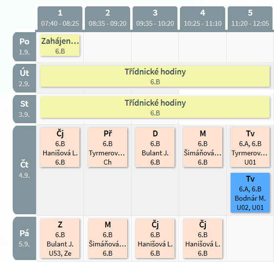 Začínáme v pondělí, kdy budou děti ve škole pouze 1 hodinu. Úterý a středa jsou věnovány třídnickým hodinám a končíme ve 12:05. V úterý si budeme rozdávat učebnice, děti by si tedy měly přinést aktovku. Od úterý se děti již přezouvají, proto je nutné si donést přezůvky. Čtvrtek a pátek se učíme podle běžného rozvrhu, ale také pouze do 12:05. První den nebude otevřena jídelna, ale již druhý den, tedy 2. září ano. Aby vaše dítě mohlo jít na oběd, je nutné zaslat platbu stravného co nejdříve. Níže přikládám orientační rozvrh pro první týden.